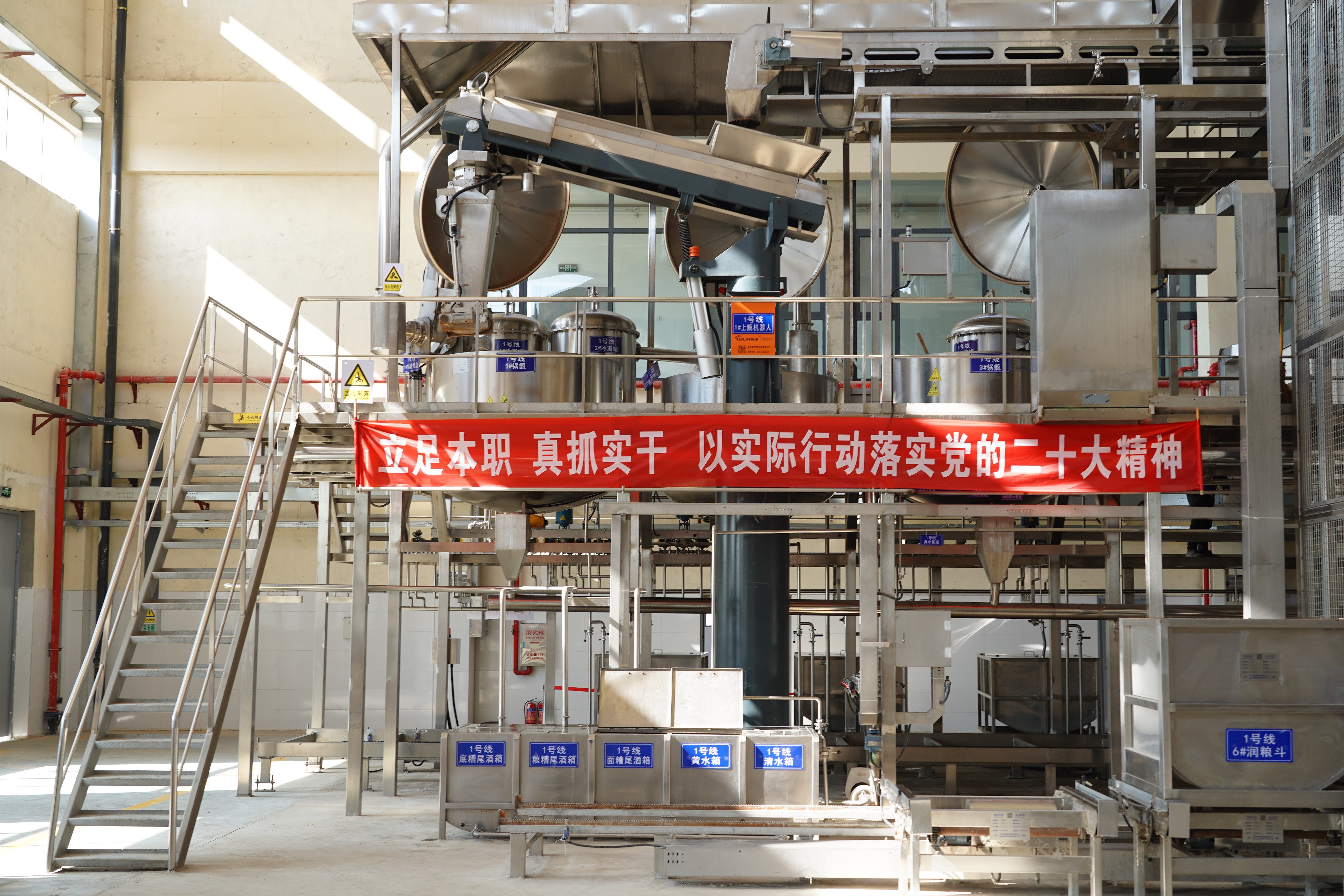 智能釀造園一號釀造車間擁有行業領先的全自動釀造系統,設備投資1.5億元。從原料接收開始,直到做醅入窖,全程實現自動化,原輔材料不落地、無污染。設備均采用不銹鋼材質,確保食品衛生安全無憂。此系統實現了釀酒由傳統操作向現代智能化轉變,很好的解決了多年困擾釀酒傳統行業人工操作不能機械替代的難題。